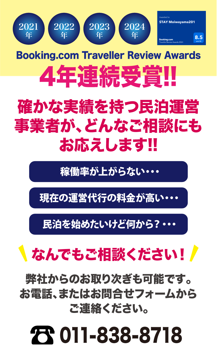 このように、民泊運営の開始から、ご利用者様の支持を得つつ事業を拡大する方法を熟知する弊社関連会社では、民泊の運営代行やコンサルティングも行っております。上記のようなお悩みのある経営者の方々、また民泊運営をしてみたいが何から始めてよいか判らないといった方は、ぜひ、一度ご相談くださいませ。