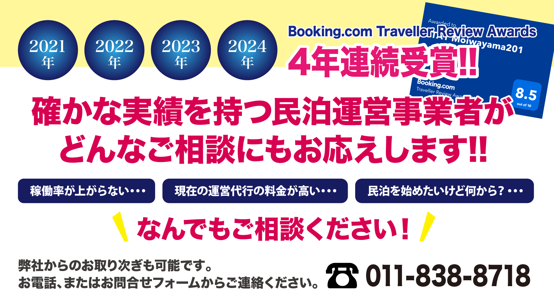 施設は2021年から4年連続でBooking.com主催のTraveller Review Awardsを受賞するほど、ご利用者様からありがたい評価を多数頂戴しております。また、Booking.comに登録する全施設の上位30%だけが利用を認められるプリファード・プログラムに参画することで更なる露出を図ることで、現在も順調に稼働率を向上させております。